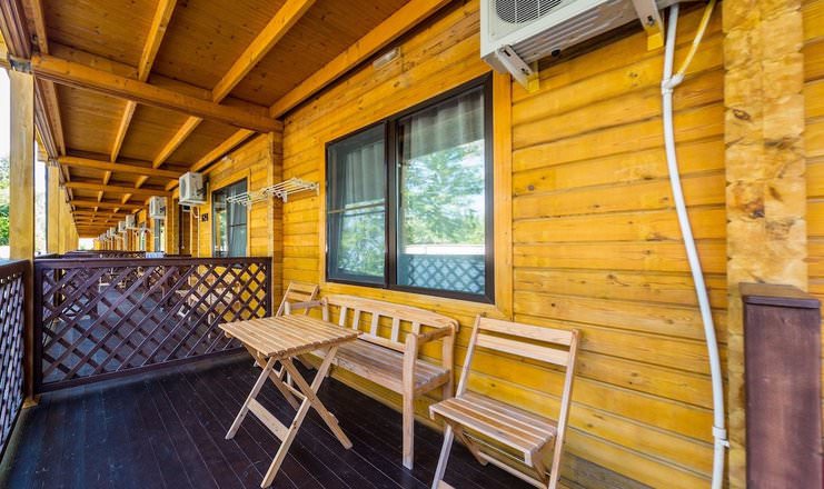 Общая на два номера терраса с обустроенной зоной отдыха, сушилка. Возле каждого номера стоят стол и скамейка.